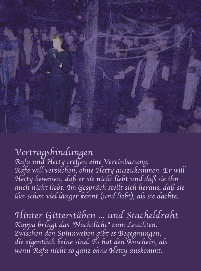 Als ich durch das Gedränge rechts von der Tanzfläche ging, kreuzte unerwartet Rafa meinen Weg. Er rief einem Jungen einen Gruß zu. In seinem dünnen weißen Hemd streifte Rafa recht ausgedehnt an mir entlang. Währenddessen vertiefte er sich in ein Gespräch mit dem Jungen. Ich lehnte mich von hinten an Rafa, zog ihn an mich, streichelte seinen Arm und ging weiter. Rafa sendete etwas aus wie Widerstand. Ich meinte, ein "Laß' das, Hetty!" zu vernehmen.