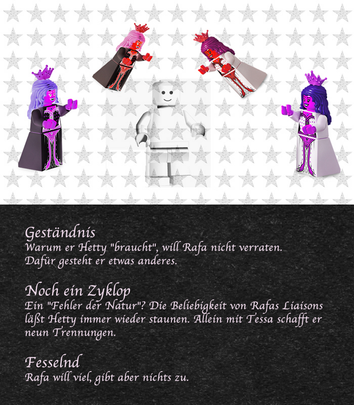 "Dafür gibt es einen einfachen Grund", erwiderte ich. "Ihr Gesicht ist starr und ausdruckslos, weil sie nicht viel auszudrücken hat. Und sie redet nicht viel, weil sie nicht viel zu sagen hat. Das wirkt dann cool und unnahbar. Sie ist ein leeres Geschöpf, und sie versucht, sich mit Rafa zu füllen."