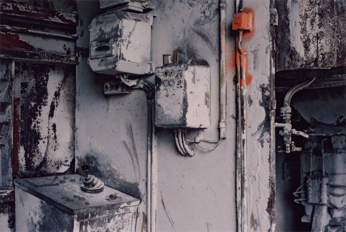 Auch Sylvain sucht das Melancholische, das Faßbare in der Trauer. Er setzt dies auf seine Art spielerisch um. Er baute aus Schutt ein Kreuz und fotografierte es. Er suchte und fand in dem Gebäude mit dem Treppenhaus gekachelte Sanitärräume, so finster und unheimlich, wie er sie vor Kurzem in einem Traum gesehen hat. Solche gekachelten Räume jagen auch mir Schauer über den Rücken. Sie erinnern an Schlachthäuser und Leichenhallen.