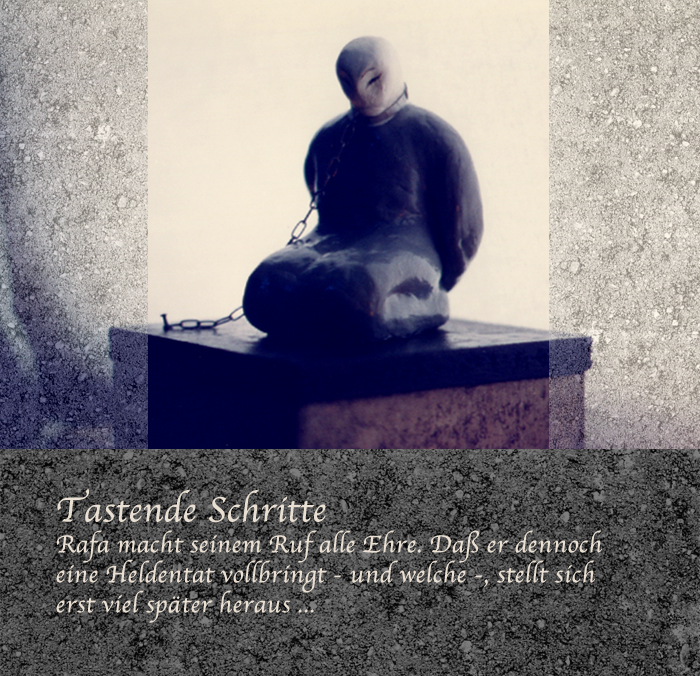 Im "Elizium" konnte ich Rafa zuerst nicht finden, wie am vorherigen Samstag auch. Er hatte sich gut versteckt. Schließlich kam er mit seiner Freundin zur Stahltür. Er lächelte ein unecht wirkendes Lächeln. Mir warf er einen flüchtigen Blick zu. Als die Freundin die Treppe hinaufstieg, sah ich, daß ihre zerrissene Jeansjacke über Rafas Schulter hing, einem Schutzschild gleich. Ich zeigte das Rikka und bemerkte: