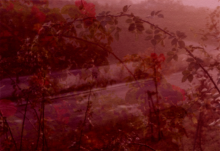 Die Sonne schien durch den Nebel und ließ die Regentropfen auf den Dornenranken glitzern.
